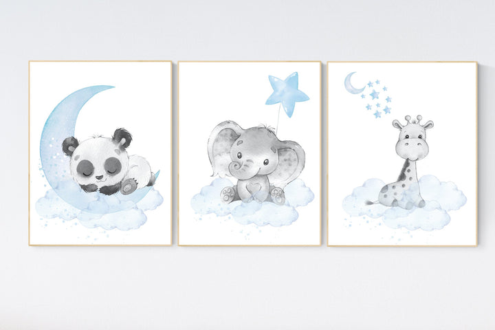 Nursery wall art animals, baby room decor blue, baby room decor panda bear, elephant, giraffe, animal nursery decor, nursery prints boy room
