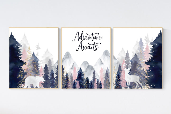 Nursery decor woodland, mountain wall art, pink gold nursery decor, adventure theme nursery, forest, pink and gray, woodland animals