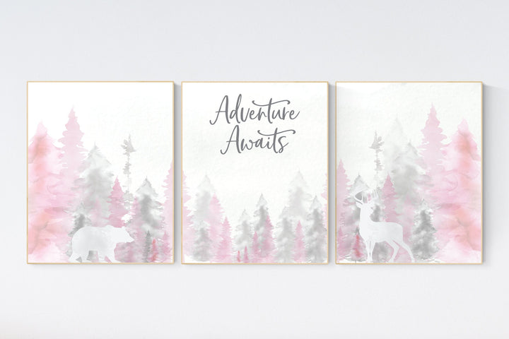 Nursery decor woodland, mountain wall art, tree nursery decor, adventure theme nursery, forest, pink and gray, woodland animals, pink gray