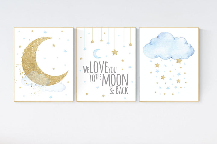 Nursery decor boy, blue gold nursery decor, cloud, stars and moon, boy nursery room wall decor, baby blue and gold, nursery prints