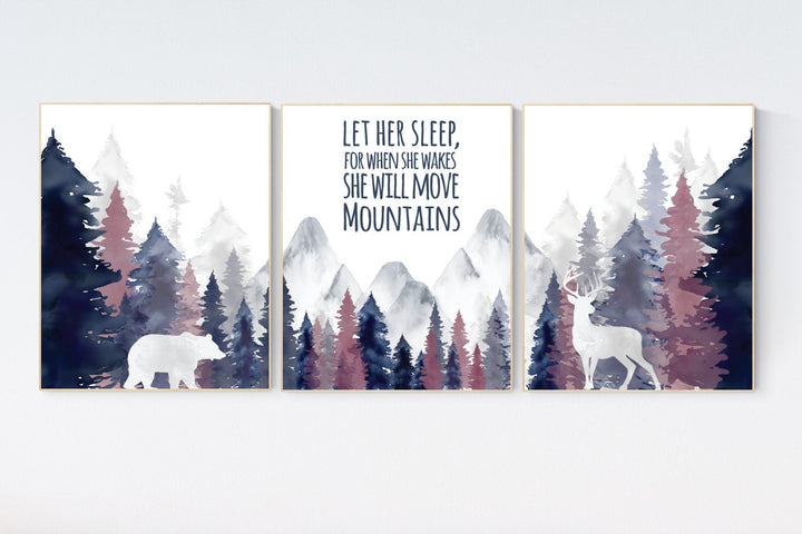 Nursery decor woodland, mountain wall art, tree nursery decor, adventure theme nursery, forest, navy, plum color, woodland animals, forest