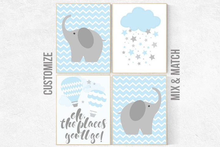 Nursery decor boy, oh the places you'll go, nursery decor elephant, nursery name sign, nursery prints boy, nursery print set boys room decor