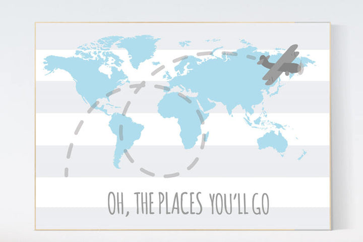 Nursery decor map, Oh the places you'll go, world map nursery, Blue nursery decor, world map wall art, baby boy nursery, nursery decor boy