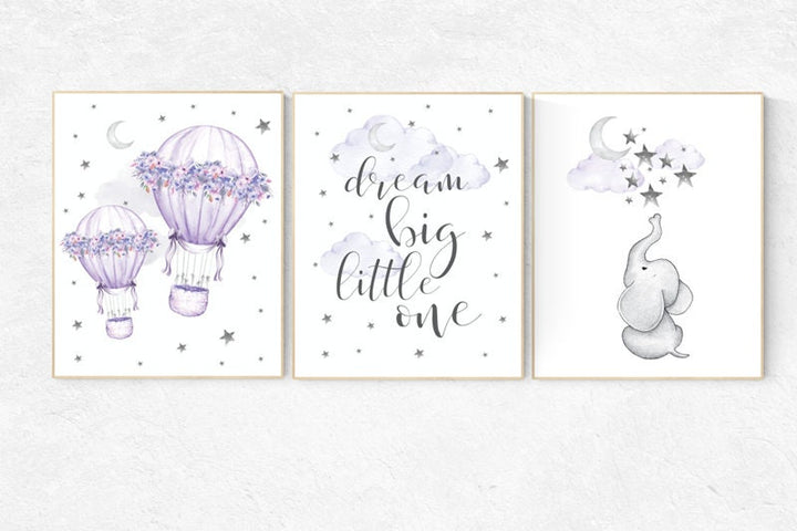 Nursery decor girl purple, cloud and stars, hot air balloons, lavender nursery, lilac nursery decor, hot air balloon, dream big little one