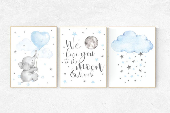 Elephant nursery, Blue and gray, we love you to the moon and back, Nursery decor boy, nursery decor, boys room, clouds and stars, blue grey
