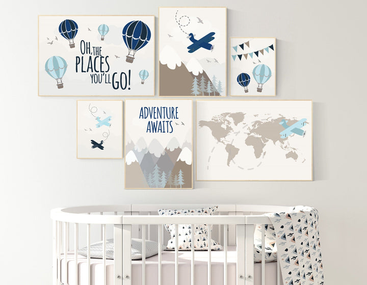 Nursery decor boy mountains adventure, mountain nursery art, adventure awaits. mountain, hot air balloon, planes, world map, gender neutral