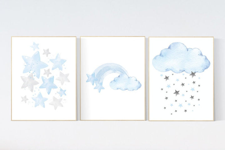 Nursery decor boy sky, Blue nursery decor, cloud and stars, moon and stars, blue nursery art. baby room wall art, set of 3, nursery art,