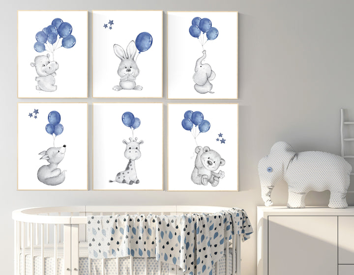 Navy nursery decor, nursery wall art boy, Nursery prints animals with balloons, Nursery balloons art, giraffe, fox, bunny, elephant