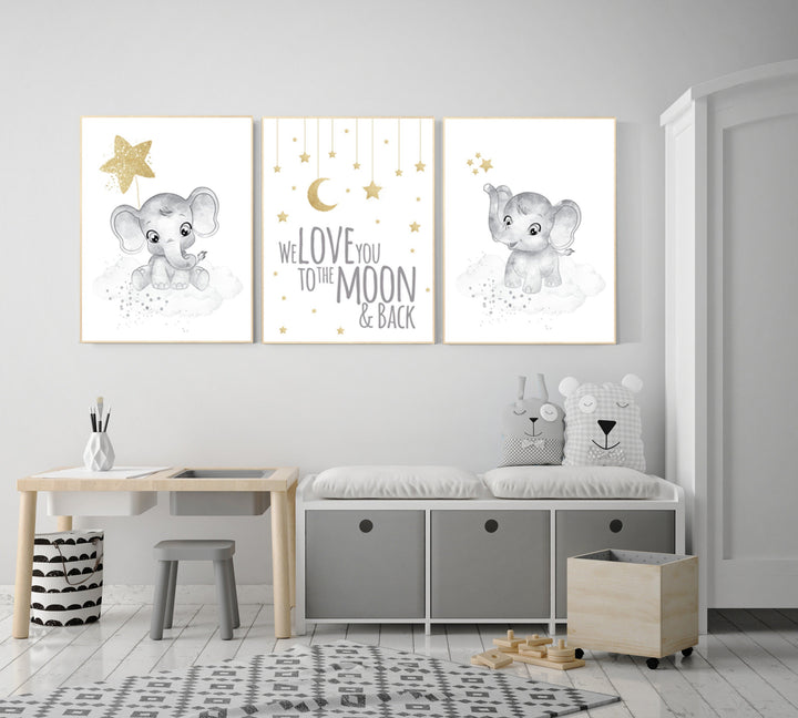 Gender neutral nursery wall decor, grey gold nursery, gray gold, elephant nursery, we love you to the moon and back, moon and stars