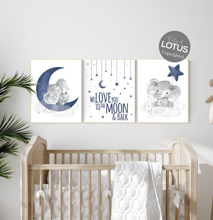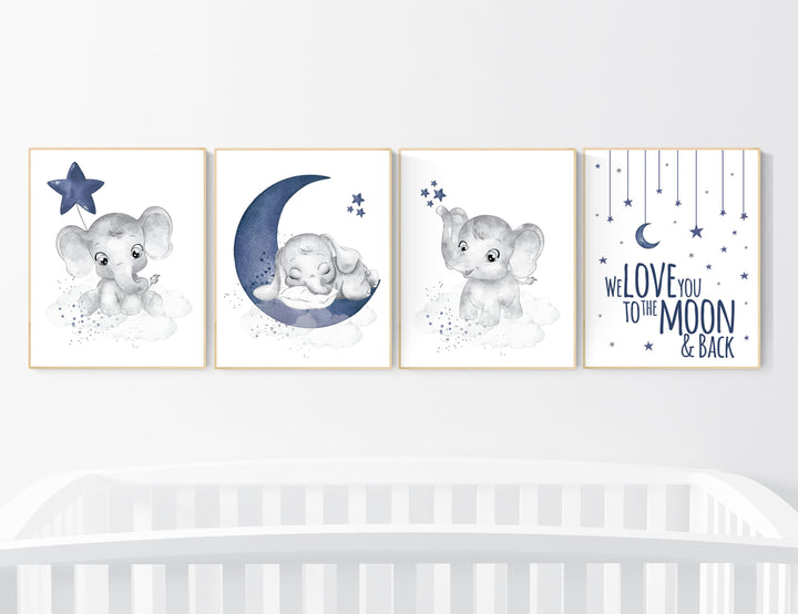 Nursery decor boy elephant, navy nursery decor, we love you to the moon and back, moon and stars, navy blue nursery art, elephant nursery
