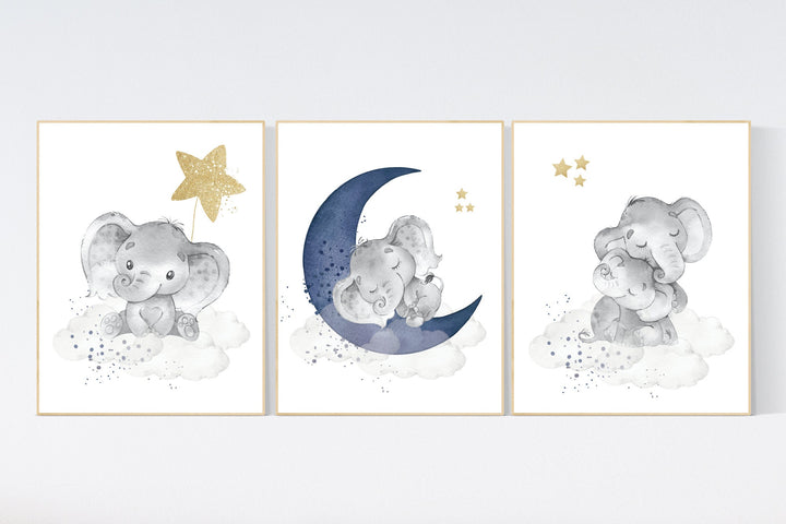 Navy nursery decor elephant, cloud and stars, moon and stars, navy gold nursery art. baby room wall art, boy nursery decor, nursery art