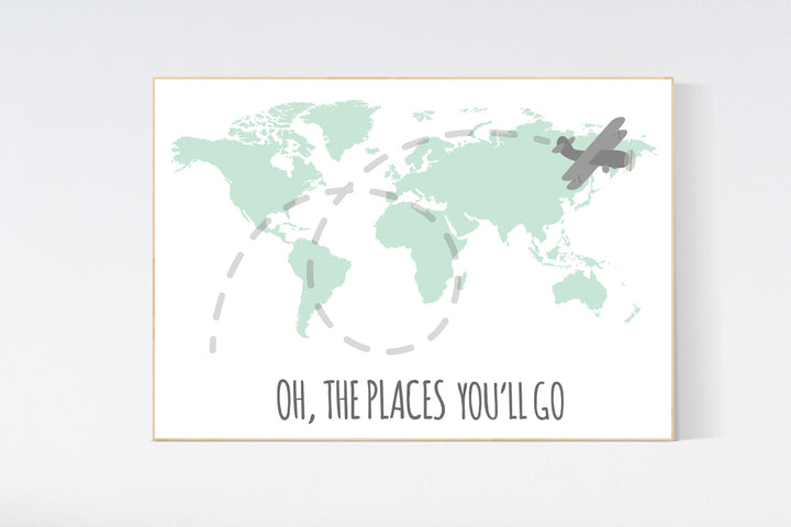 Mint nursery decor, Oh the places you'll go, World Map wall art, world map nursery, world map wall art, gender neutral nursery decor, mint