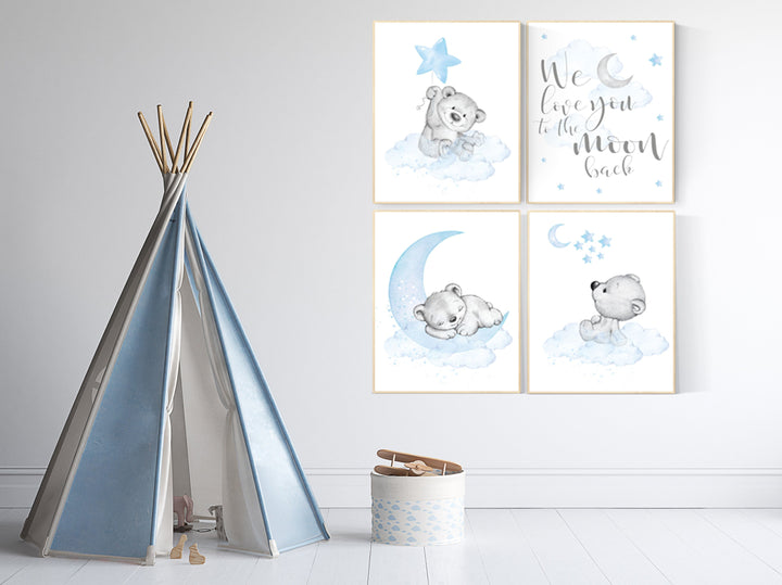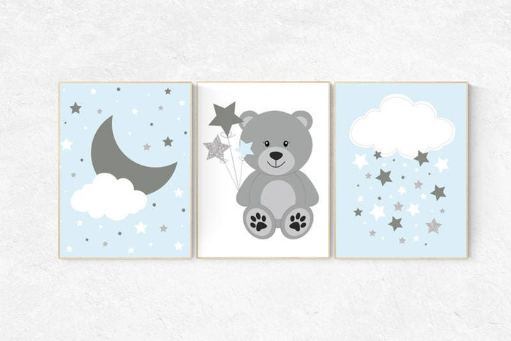 Nursery decor bear, Nursery decor boys Blue gray nursery, boys room wall art, baby room prints, cloud nursery, blue nursery, teddy bear