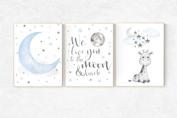 Giraffe nursery, we love you to the moon and back, Blue and gray, Nursery decor boy, nursery decor giraffe, clouds and stars, blue grey