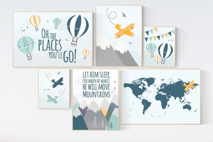 Nursery decor boy mountains adventure, let him sleep for when he wakes he will move mountains, nursery decor boy airplane, world map nursery