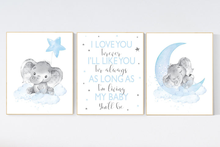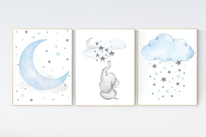 Nursery decor boy, nursery wall art elephant, baby blue nursery decor, moon and stars, blue nursery art, baby room art, elephant nursery