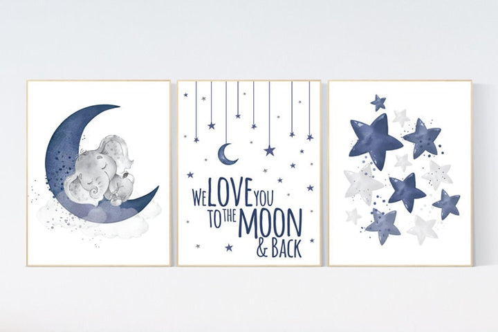 Nursery decor elephant, navy nursery decor, we love you to the moon and back, moon and stars, navy blue nursery art, elephant nursery art
