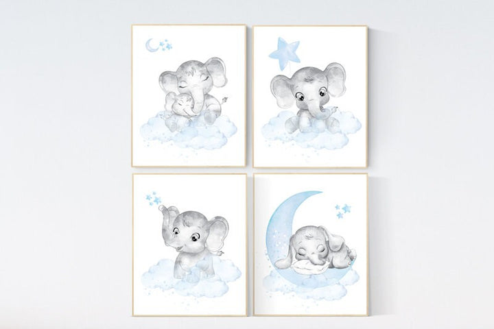 Elephant nursery, Nursery decor boy, nursery wall art, nursery art, blue nursery decor, moon and cloud, nursery decor boy modern, blue gray