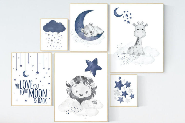 Nursery decor boy lion, bear, giraffe, boy nursery decor, moon and stars, navy blue, boy nursery wall art, we love you to the moon and back