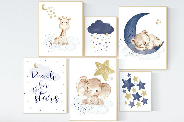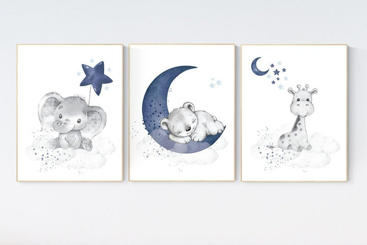 Nursery decor boy elephant, bear, giraffe, nursery wall art boy, navy Blue gold, moon and stars, boy nursery decor, animal nursery print set