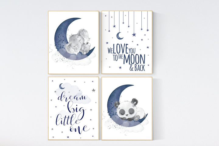 Nursery decor boy elephant, panda, navy blue nursery decor, dream big little one, moon and stars, navy blue nursery, elephant nursery