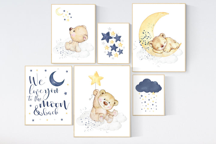 Nursery decor, bear nursery, navy yellow gray, gender neutral nursery, navy Blue, moon and stars, navy nursery, boy nursery, navy yellow
