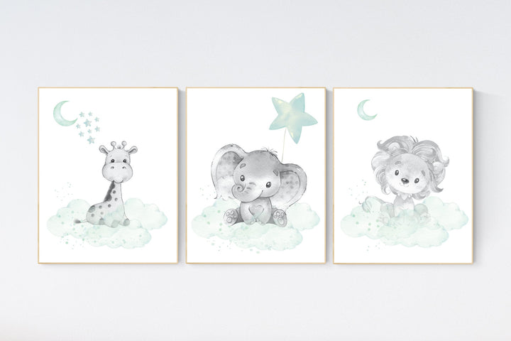 Nursery decor elephant, lion nursery, animal nursery prints, mint nursery, baby room wall decor, woodland animal prints, mint green, giraffe