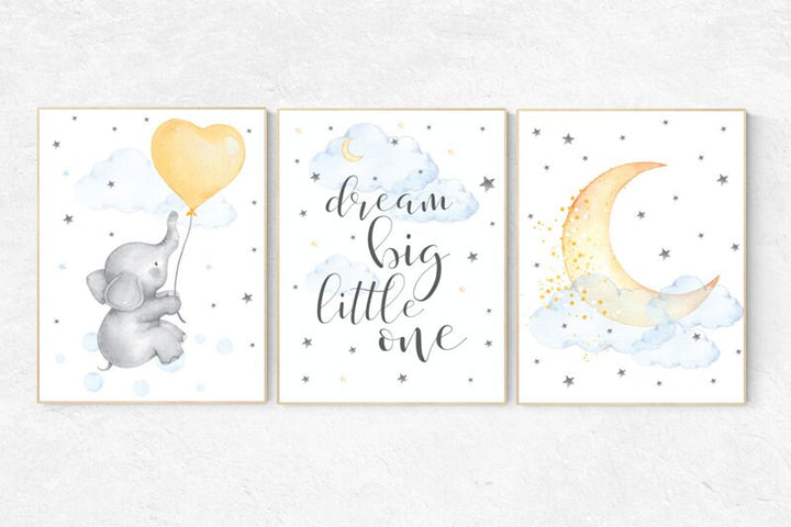 Nursery wall art elephant, dream big little one, cloud nursery decor, Nursery decor neutral moon and stars nursery moon , gender neutral