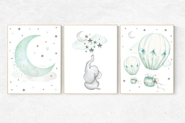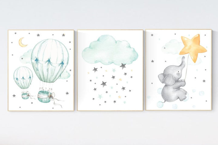 Nursery decor elephant, Mint nursery decor, hot air balloon, gender neutral nursery, nursery decor turquoise, mint green nursery wall art