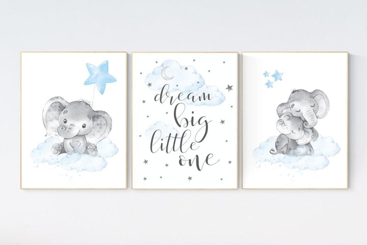 Blue Gray Nursery Art, nursery decor elephant, nursery decor boy cloud, dream big little one, blue and gray elephant nursery
