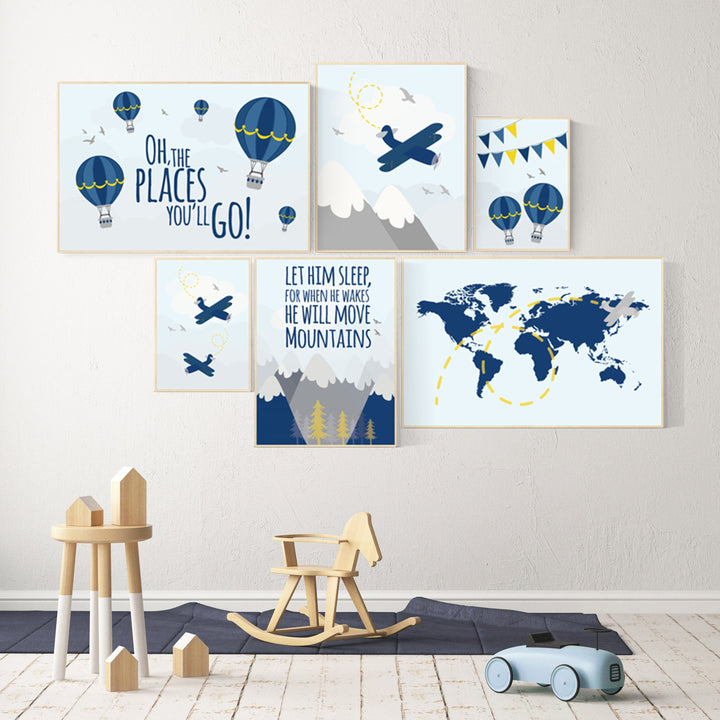 Nursery decor boy travel, Adventure nursery decor, nursery decor boy plane, world map nursery, mountain nursery, navy yellow, boy nursery