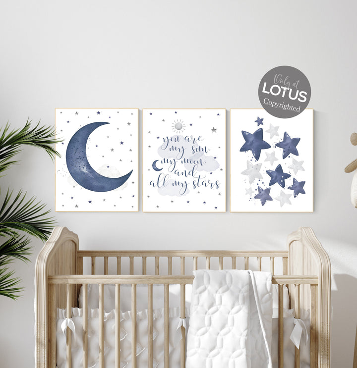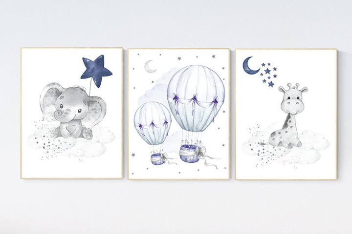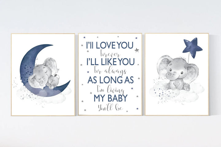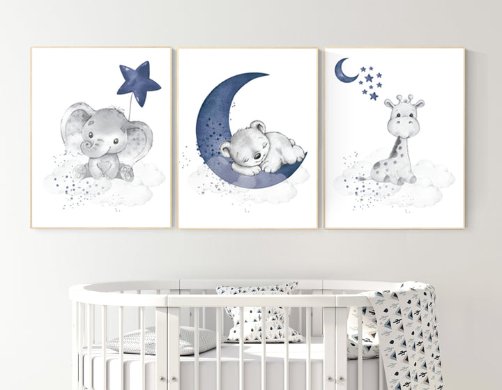 Navy nursery decor, moon and stars, navy blue nursery art. baby room wall art, boy nursery decor, set of 3, nursery prints boy, elephant art