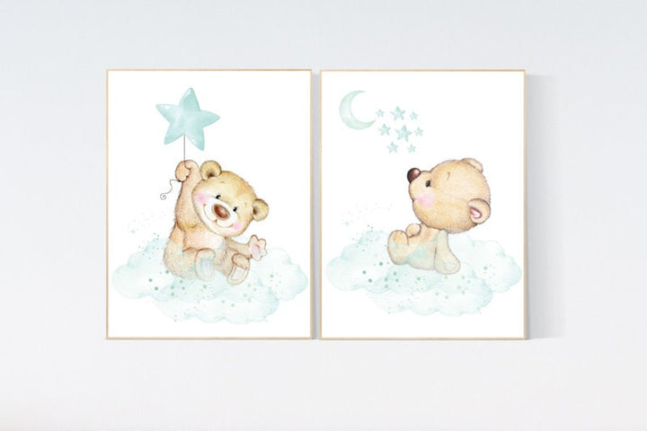 Nursery wall art bear, nursery decor animals, nursery decor woodland, nursery prints mint, teddy bear, mint green nursery