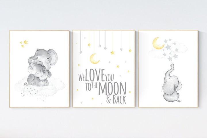 Yellow nursery wall art, nursery wall art elephant, moon and stars, gender neutral, yellow and gray nursery art, baby room decor, neutral