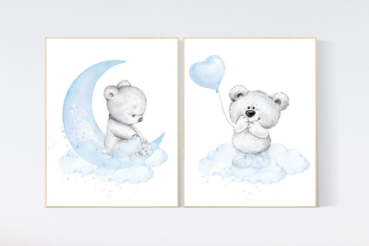 Nursery wall art bear, nursery decor animals, nursery decor woodland, nursery prints blue, teddy bear, baby blue, baby bear nursery