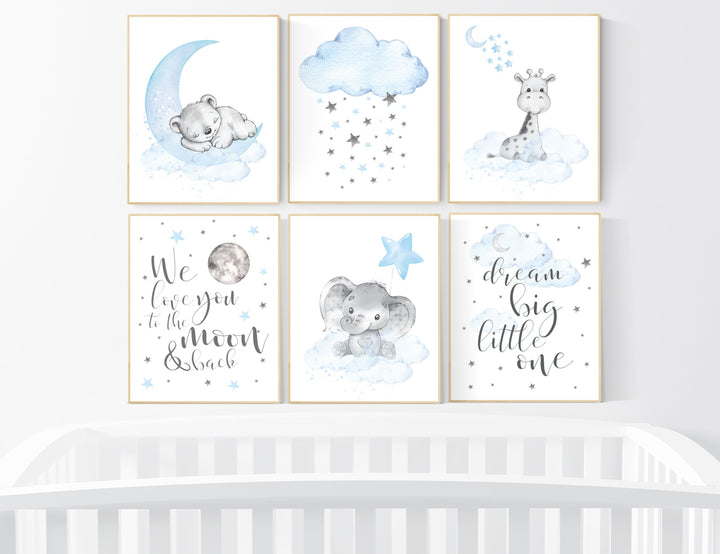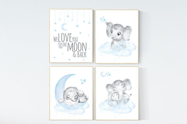 Nursery decor boy, nursery decor elephant, nursery wall art, nursery art, blue nursery decor, moon and stars, elephant nursery prints