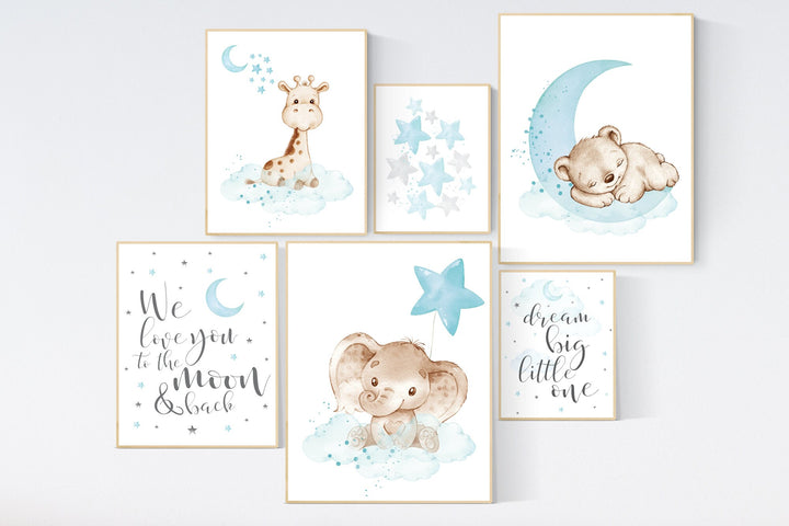 Nursery decor boy bear, giraffe, elephant, animal prints, Animal nursery wall art, bear decor for nursery, blue grey elephant, boys nursery