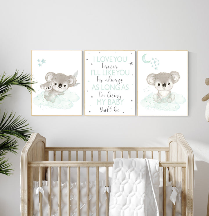 Koala nursery, mint nursery, moon and stars, mint green nursery art, nursery prints animals, gender neutral nursery, koala mother and baby