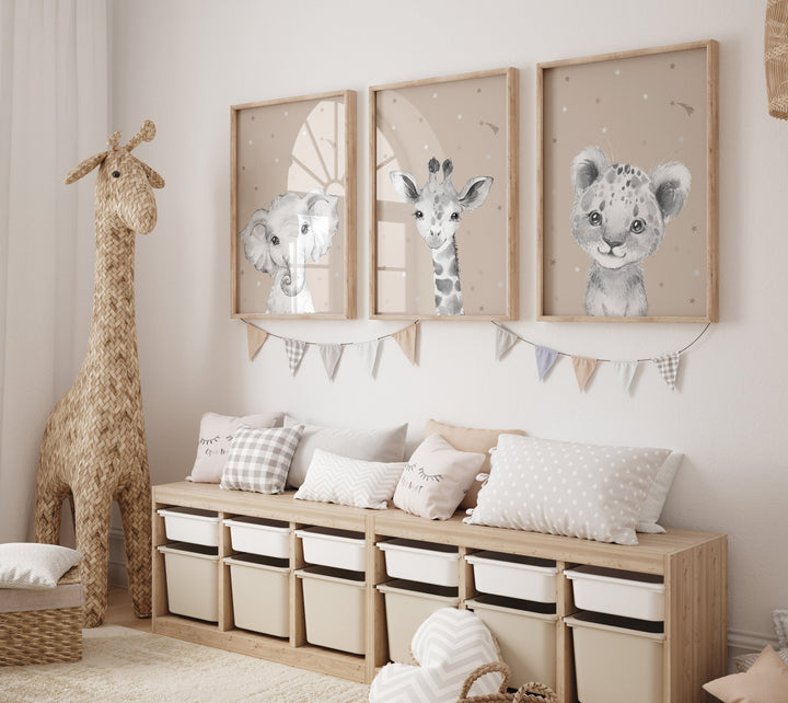 Nursery decor elephant and giraffe, animal nursery prints, grey nursery, neutral nursery, baby room wall art, woodland animals, gray nursery