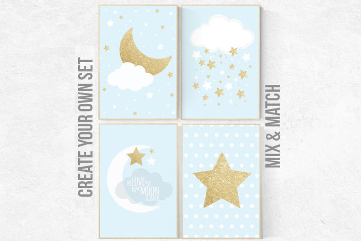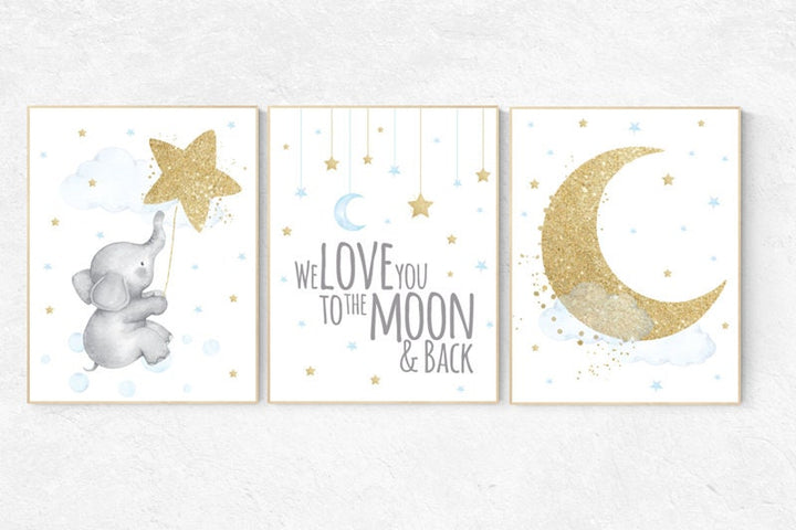 Nursery decor boy elephant, blue and gold nursery, we love you to the moon and back, blue nursery wall art, cloud and stars, baby room decor