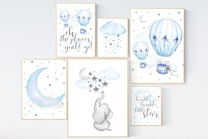 Nursery decor boy elephant, blue and gray nursery, hot air balloon, twinkle twinkle little star, boys room decor, oh the places you'll go