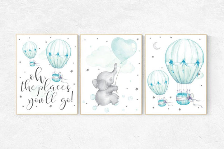 Mint nursery decor, nursery decor elephant, hot air balloon, gender neutral nursery, oh the places you'll go, mint green nursery wall art