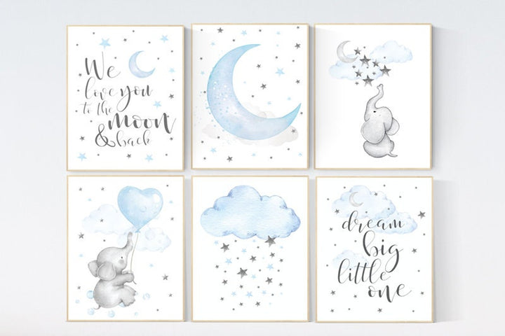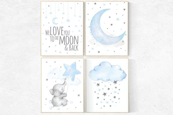 Nursery decor boy elephant, Nursery wall art boy, we love you to the moon and back, nursery art, blue nursery decor, cloud and stars,