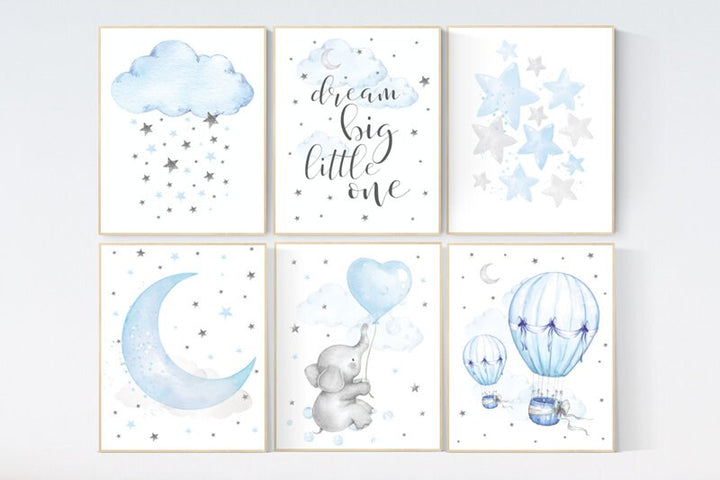 Nursery decor boy elephant, nursery wall art boy, Blue and gray, cloud and stars, hot air balloon, elephant nursery art, moon nursery