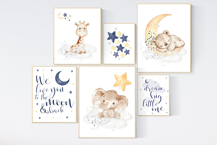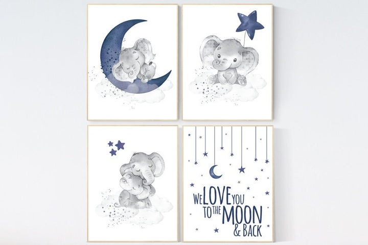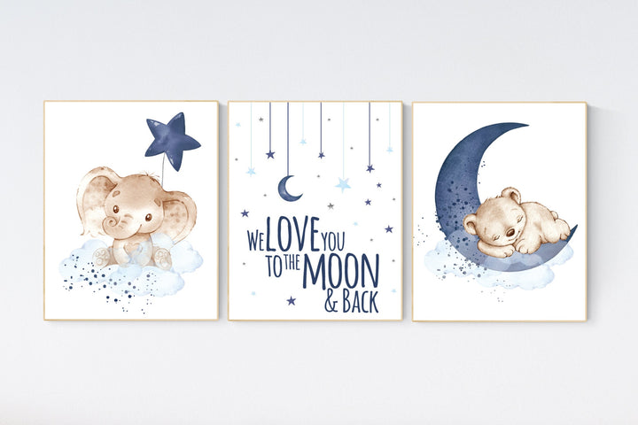 Nursery decor boy elephant, navy nursery decor, we love you to the moon and back, moon and stars, navy blue nursery art, elephant nursery