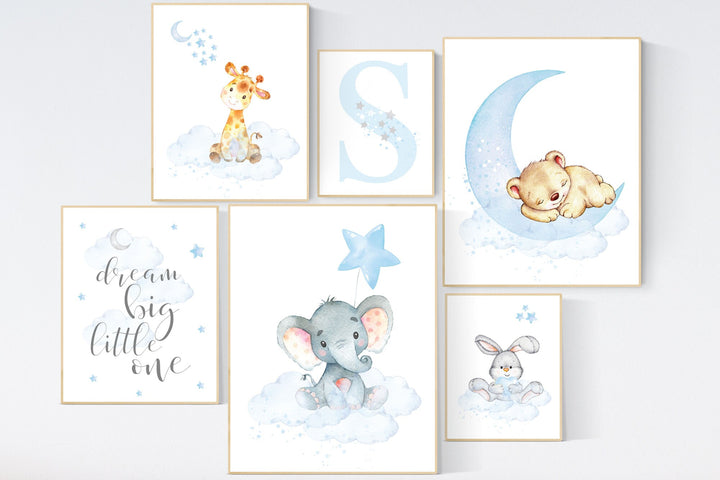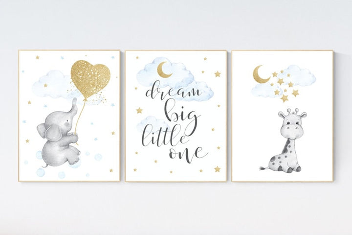 Nursery decor boy elephant, blue and gold nursery, dream big little one, blue nursery wall art, cloud and stars, baby room decor, wall art