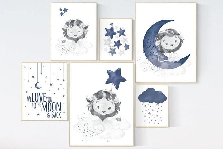 Nursery decor boy lion, boy nursery decor, moon and stars, navy nursery, boy nursery, we love you to the moon and back