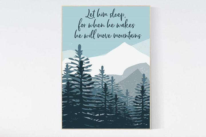 Nursery decor boy mountain, adventure, nursery wall art woodland, let him sleep for when he wakes he will move mountains, baby room decor