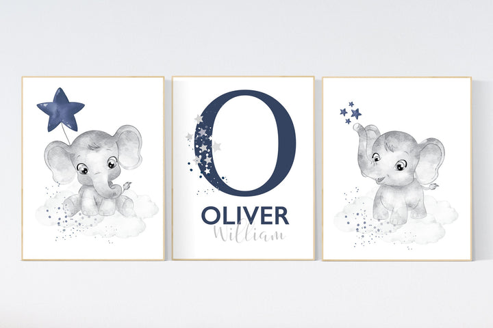 Nursery decor elephant, navy nursery decor, cloud and stars, moon and stars, navy blue nursery art. baby room wall art, elephant nursery