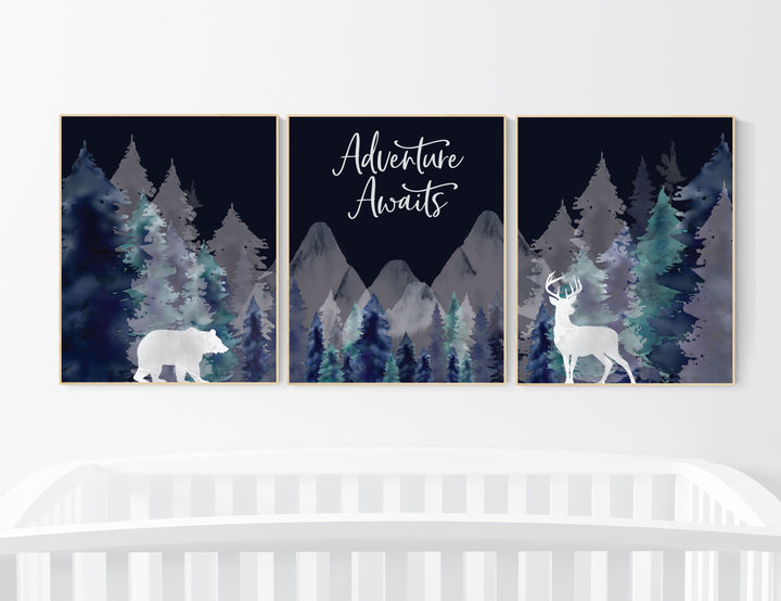 Nursery decor boy woodland, mountain wall art, tree nursery decor, adventure theme nursery, forest, navy and teal, woodland animals